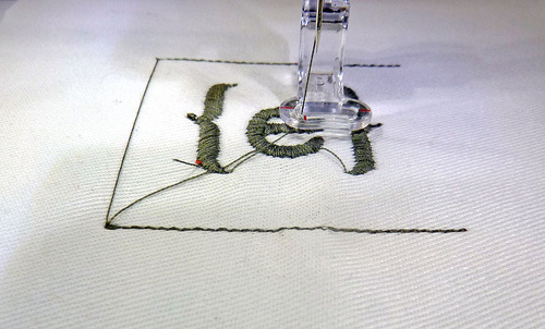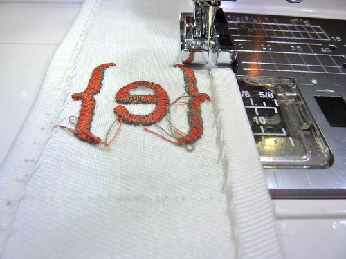- Hoop the twill fabric and stabilizer. Monogram the letter of your choice surrounded by the brackets.