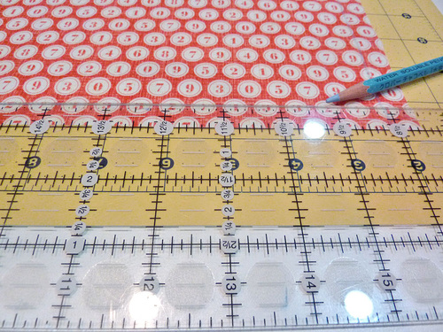 - Using a fabric pen or pencil, draw in the following guidelines: ½” in along all four raw side edges as a seam allowance guideline, a horizontal line 4½” down from the top 9½” raw edge, and a horizontal line 9″ down from and parallel with the top 9½” raw edge.