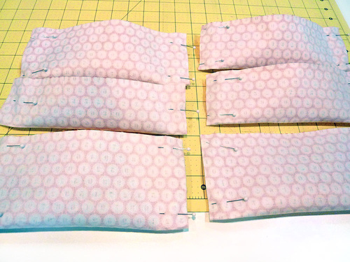- Fold all the pockets in half, retaining the 9″ width of each piece but with varying heights. Pin along the both sides and across the bottom of each of the six pockets, leaving an approximate 2-3″ opening along the bottom edge for turning.