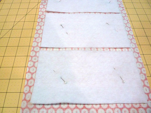 - Place the fleece onto the wrong side of the main panel. Centering each fleece panel within the guidelines side to side and top to bottom. The two slightly larger panels go in the top and middle sections, the smaller panel in the bottom section. There should be slight gaps between the panels as shown in the photo below to allow for easier folding.