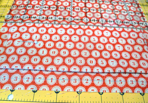 - Place one pair in the center section. The bottom edge should ½” up from the lower horizontal fold line. The top edge should ½” below the upper horizontal fold line. The sides should each be approximately ⅛” in from the seam allowance guidelines. Pin in place.