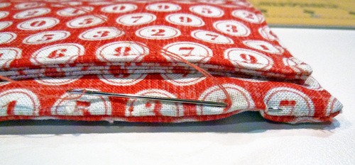 - Using a ½” seam allowance, stitch down both side seams and across the bottom of each pocket. Remember to pivot at the corners and to lock the seam on either side of the 2-3″ opening.