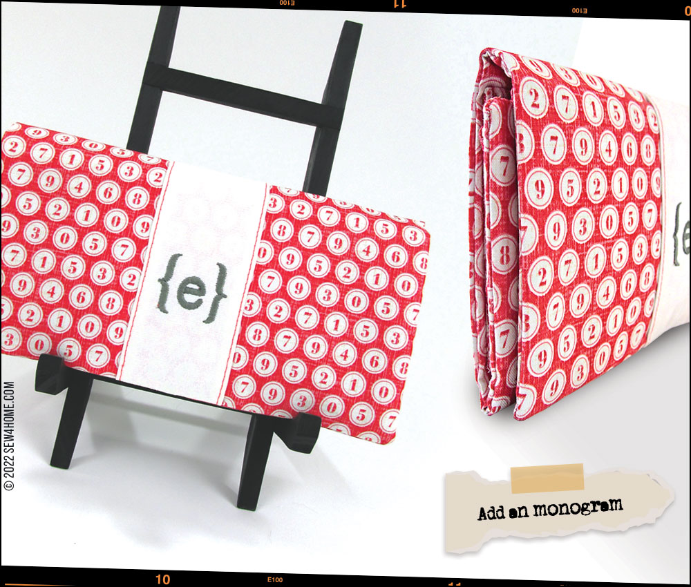 The finished wallet folds up in thirds and is secured with an elastic loop and button. We added a pretty optional monogram within the vertical accent band. Click here to download the full alphabet and brackets. This free download is available in six major machine embroidery formats.