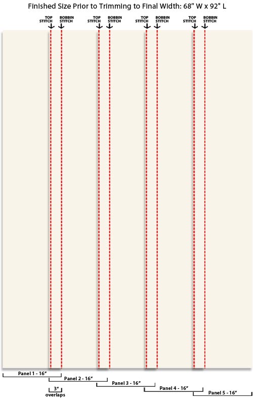 - Our duvet is reversible, so we cut an additional FIVE 92″ panels for the back. You could use a coordinating fabric (we would recommend a décor weight) or even a ready-made sheet for the back if you choose. If we had done this, we would have needed one piece 64″ wide x 92″ long or a combination of seamed together panels to finish at this dimension.