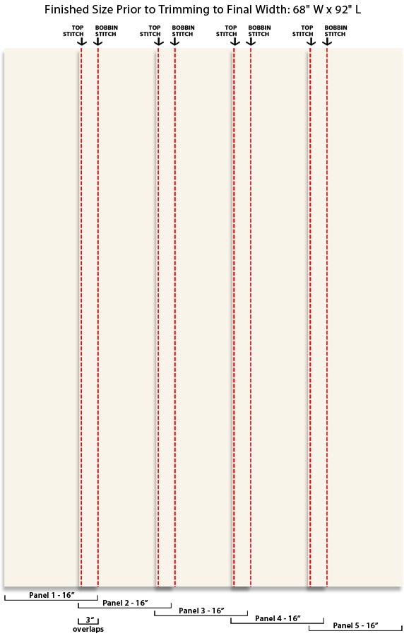 - The Moda pre-hemmed toweling is 16″ wide. Our overlapping technique (similar to shingles on a house) will take up 3″ at each of the four overlap intersections, so we will lose 12″. Once the panels are sewn together, we need at least 64″ in width to account for our 63″ finished width plus 1″ for a seam allowance. Four panels is not enough (16″ x 4 less 12″ = 52″), but five panels gives us plenty (16″ x 5 less 12″ = 68″). The excess will be trimmed prior to seaming front to back. So, we know we need to use five panels of toweling. Increase as needed if you are making a full, queen or king.