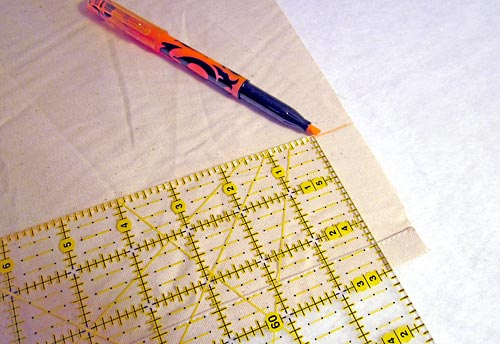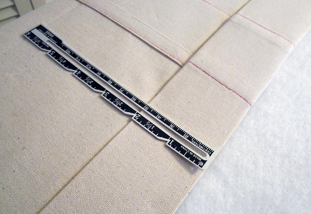 - On the right edge of panels 1 through 4, use your fabric pen or pencil to draw a line 3″ in from the hemmed edge. In other words a drawn line parallel with and 3″ from the RIGHT edge of panels 1 through 4.
