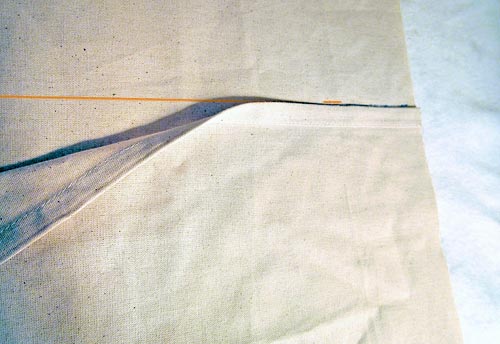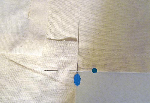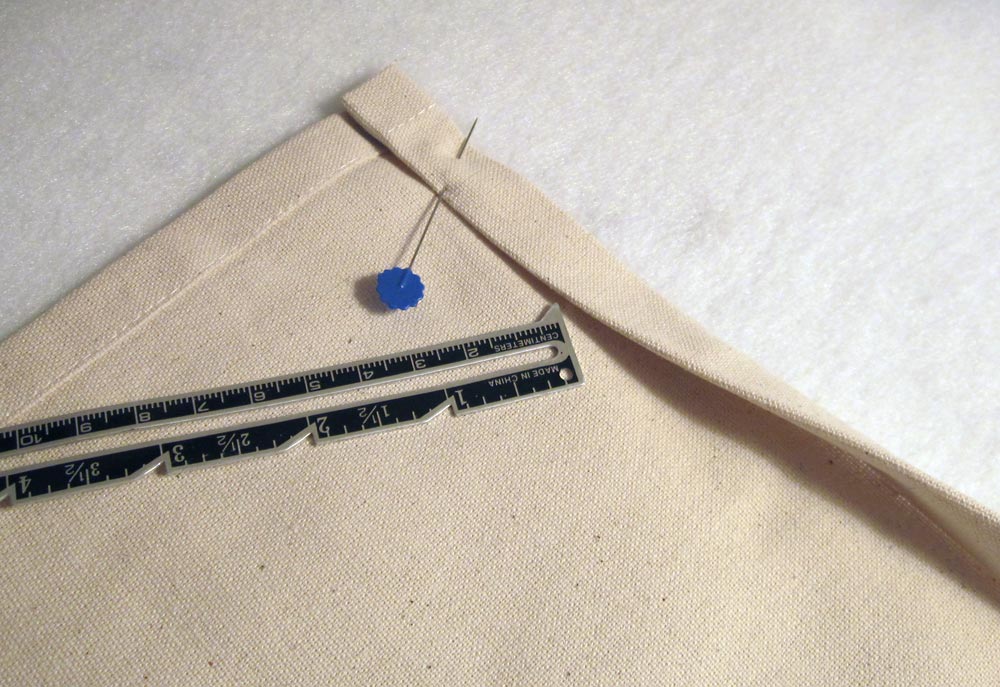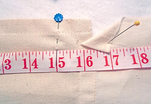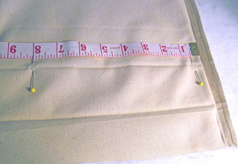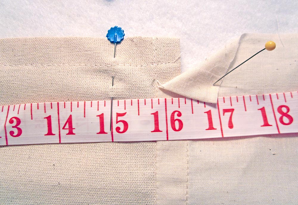 - Pin along the topmost crease line approximately 8″ in from each side seam.