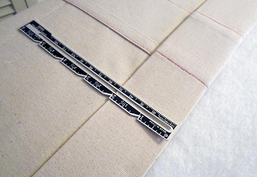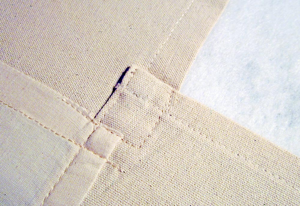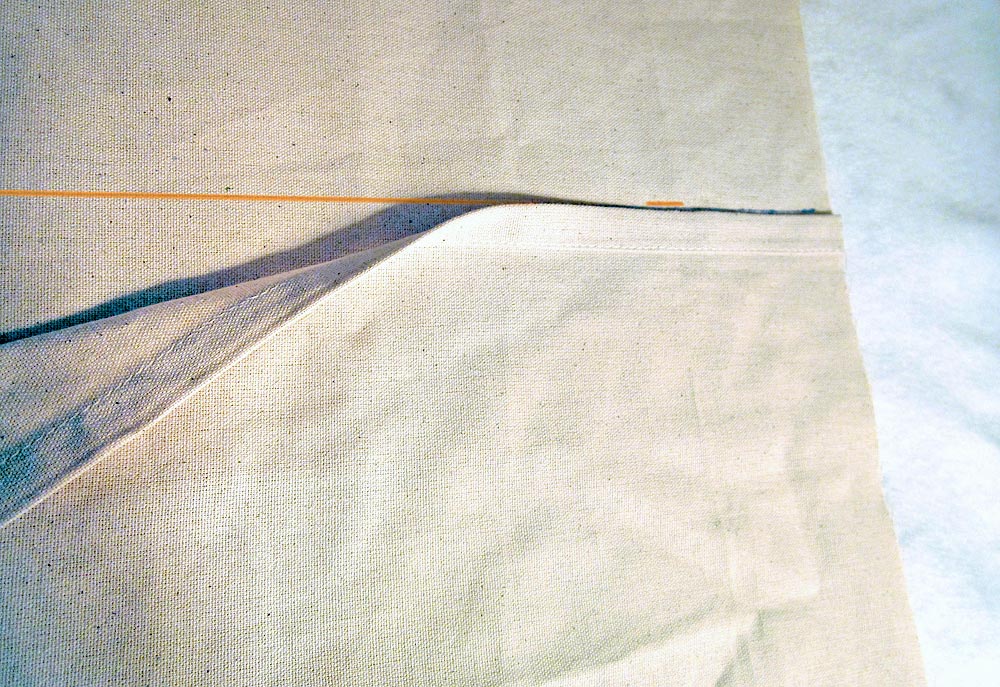 - Stitch along the crease line this 8″ distance from each side seam. Back tack securely at the 8″ point on each side as this seam will take some stress when turning the duvet inside/outside during laundering.