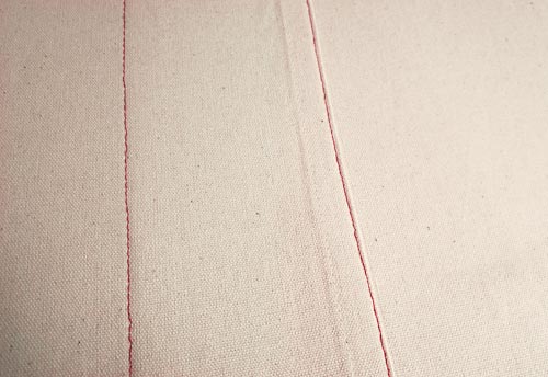 NOTE: We will be stitching from the wrong side, so the stitching that will show on the front of the quilt will be the BOBBIN stitching. This is why both the bobbin thread and the top thread must match. Make sure you are comfortable with the quality of your bobbin stitching. If you aren’t, use a thread that matches your fabric, and when you flip to the front for the second line of stitching, add a wide decorative stitch in a contrasting color. We will show you a photo of this option later. For our duvet, we used red contrasting stitching on the finished top of the duvet cover and natural matching stitching on the finished back. Then, if we ever get tired of our red, we just flip over the duvet to the all natural side. - Place your first two lapped panels under the machine, and stitch together along the overlap, staying as close as possible to the pre-hemmed edge (in this case, that would be the left pre-hemmed edge of panel 2).
