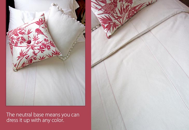We recently ran a Great Giveaway in which we asked our S4H friends and fans to come up with unique ways to use Moda’s toweling: 16″ wide, pre-hemmed panels in 100% cotton. There were some really fun ideas from kitchen linens to totes to garments, and it got our own wheels turning. We pushed our thinking out of the box and dreamed BIG. What if we looked at the toweling as long finished panels rather than little, bitty cuts? Bingo! We designed a twin duvet cover and bed skirt combo that makes full use of those wonderful pre-hemmed sides. If you’re a regular visitor to Sew4Home you might be surprised by our all-natural color theme. We needed the neutral palette so the duvet and skirt could act as a backdrop for piles of pillows and stacks of throws as we got my home studio ready for a photo shoot with Where Women Create magazine!