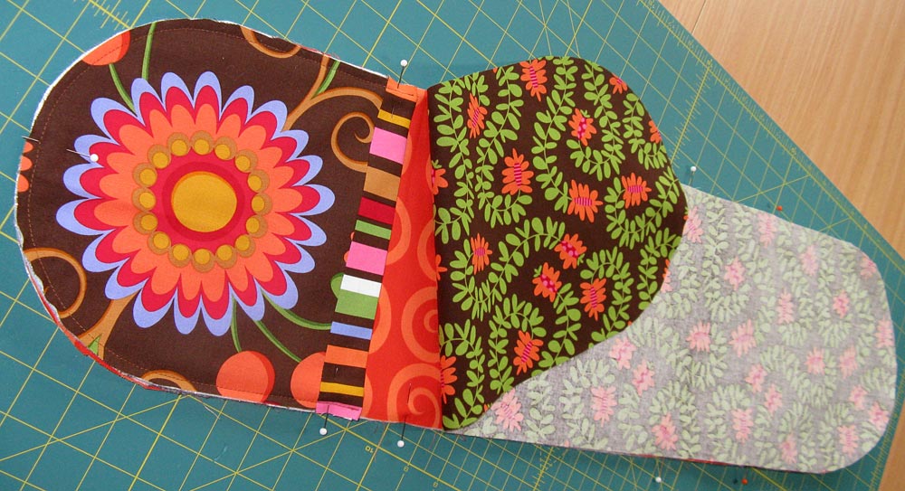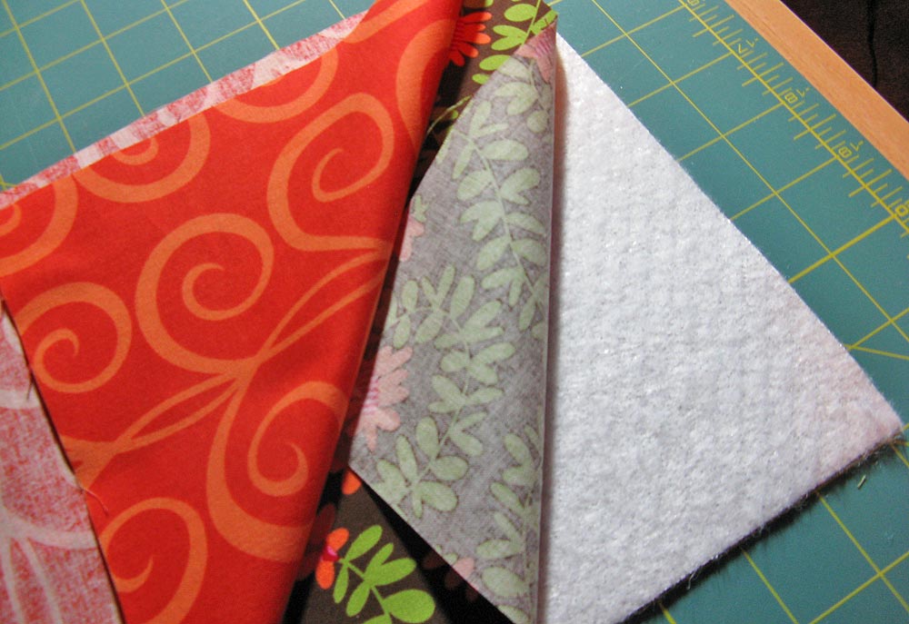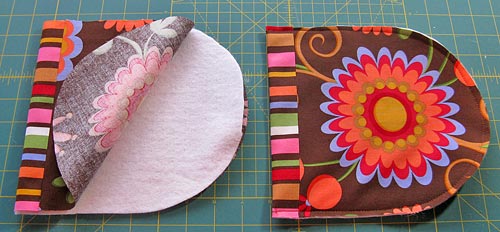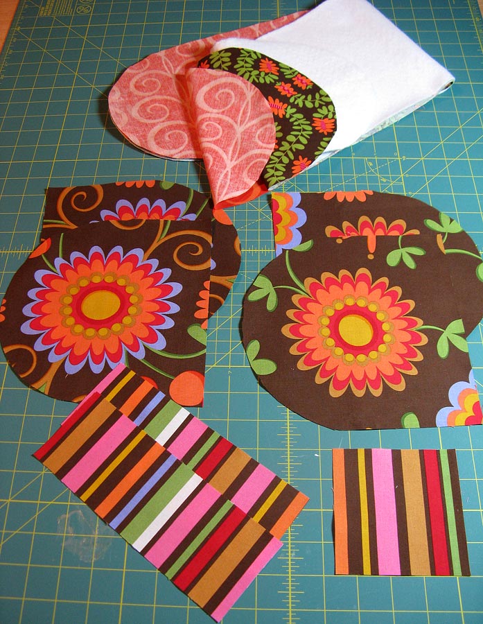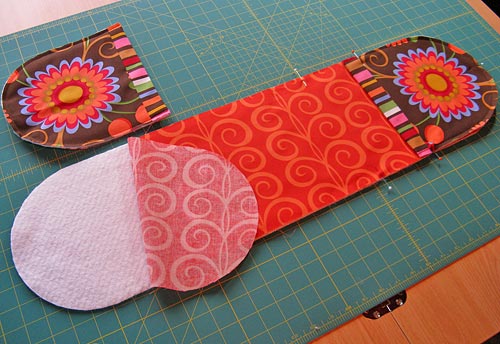 We suggest you use a thermal batting, such as Insul-Bright to insure you can handle hot pots and pans without yelping. We used just one layer for the two fabric and batting “sandwiches” that make up the pocket at either end, but you could opt for double layers – just remember that you might need to adjust the seam allowance and grade the finished seam to insure a smooth curve.