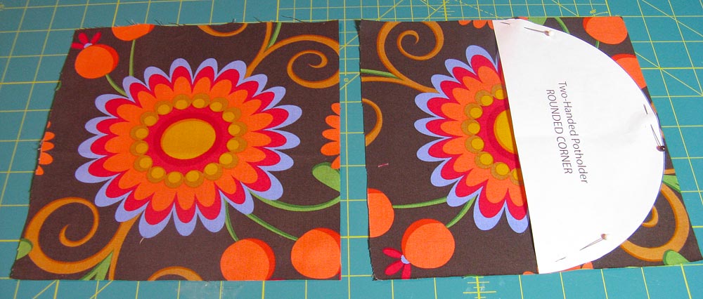 - Place the Rounded Corner Template on the outside right edge of one square, aligning as you did above for the main section. Pin and cut.