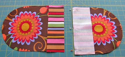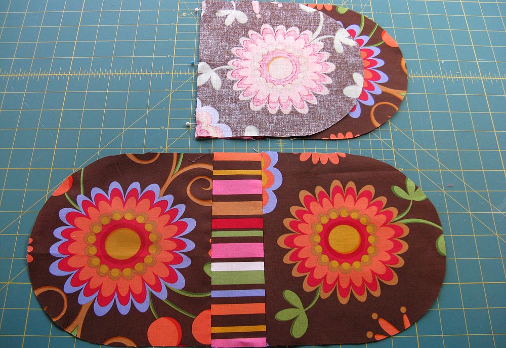 - Pin a 3″ x 8″ strip right sides together with the inside straight edge of each front mitt front piece. Stitch together, using a ½” seam allowance. Press the seam allowance open and flat.