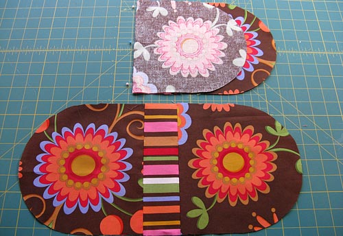 - Place the batting down first on your work surface, place the front body piece on top, right side up. Place a finished mitt on each end. Keep the raw edges of all the layers flush. Pin the layers together and the mitts in place.