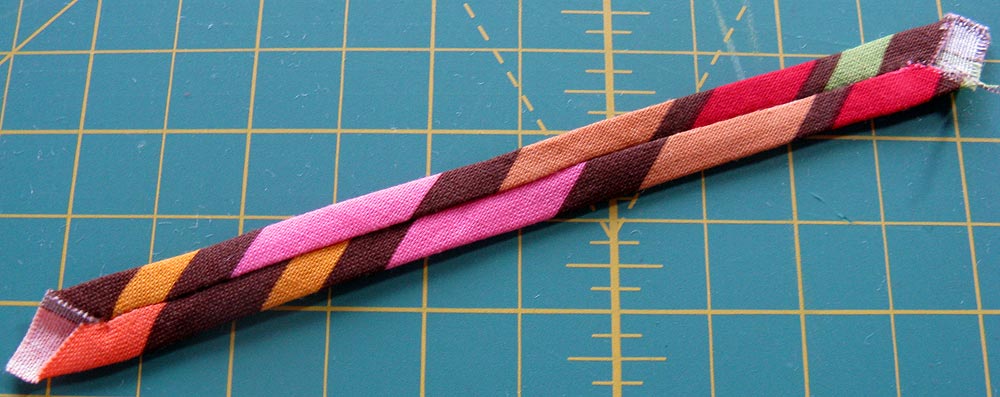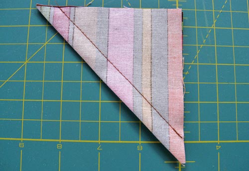 - Find your 4″ x 4″ fabric square. Fold it in half diagonally. Stitch ½” from the folded edge. This creates a tiny bias strip, which will make it easier for the final strip to fold smoothly into a loop.