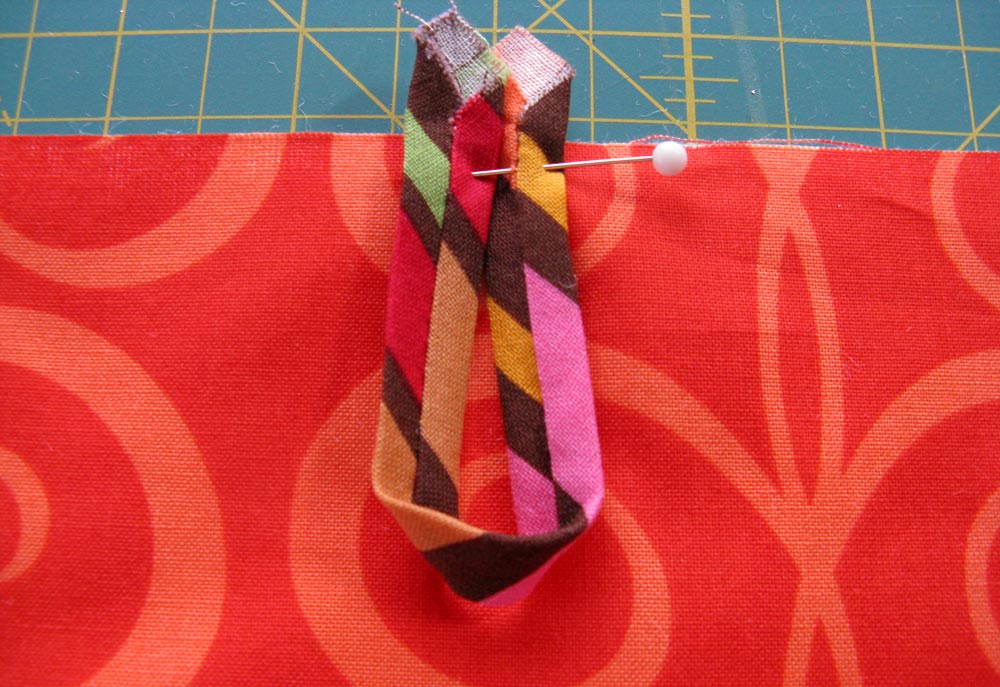 - The hanging loop should be right sides together with the hot pad body, in other words, the seam of the loop should be facing up. Adjust the loop so the pointy raw edges extend beyond the raw edge of the body. You’ll trim them off later.