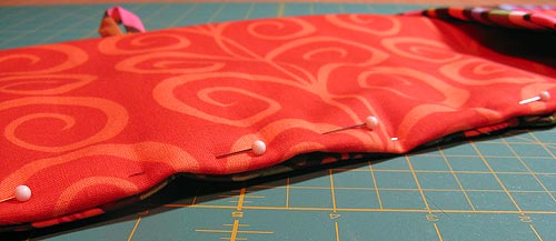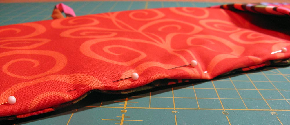 - Pin all around through all the layers, removing and then replacing the pins that were holding the front layers and mitts together. Leave an approximate 6″ opening along the edge opposite the hanger. Just to make sure you’re paying attention, in the picture below that opening is shown at the top of the photo.