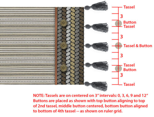- Our pillow has five evenly spaced tassels along each side. You can refer to the drawing above at the beginning of the buttonhole section to see our exact placement plan. You want a tassel at each corner with the remaining tassels evenly spaced between.