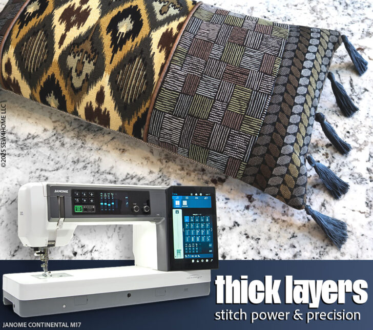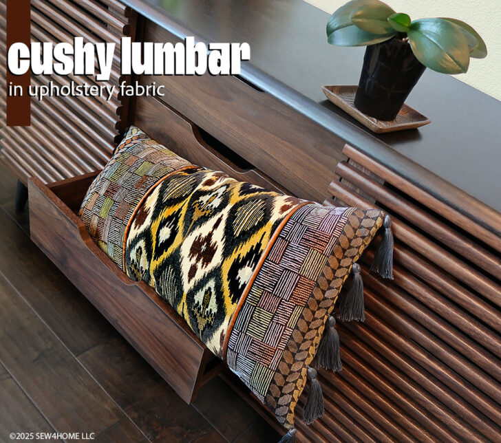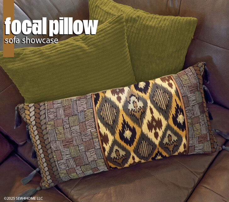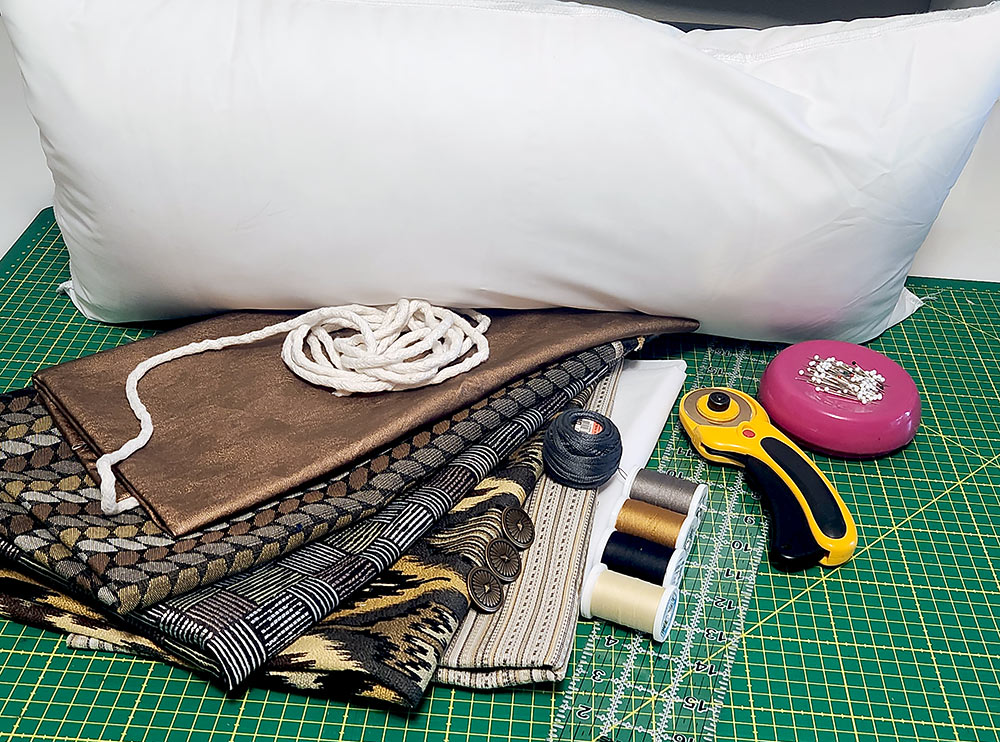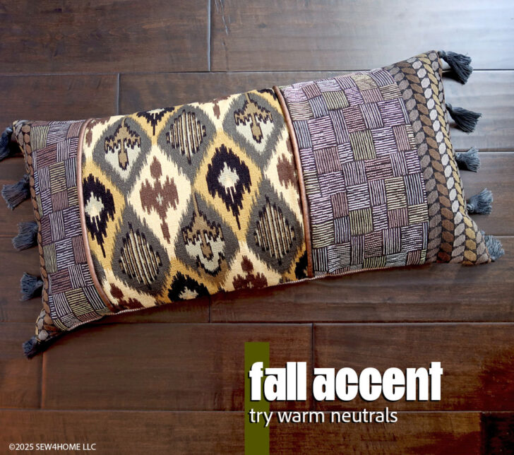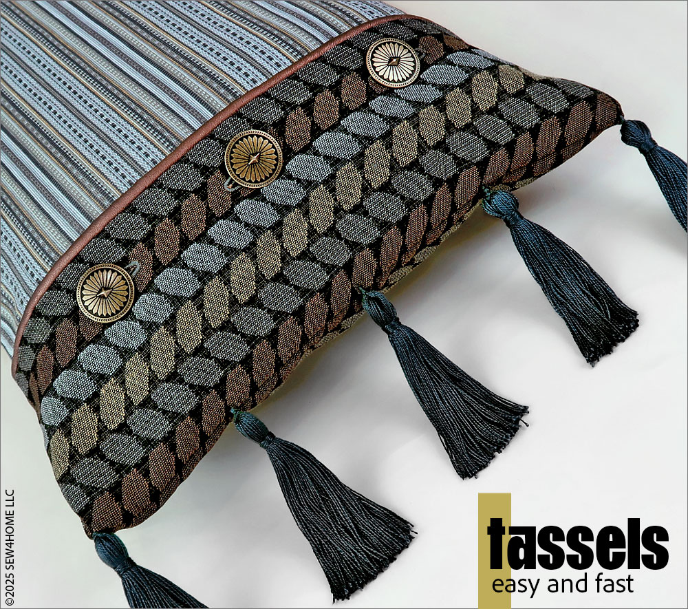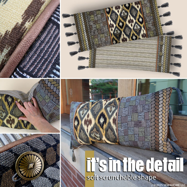 With sponsorship help from our friends at Janome America, we designed a striking lumbar pillow that allows you to bring together a beautiful blend of upholstery fabrics with classic home décor finishes, like tassels, piping, and button closures. For this project: go ahead… mx it up!