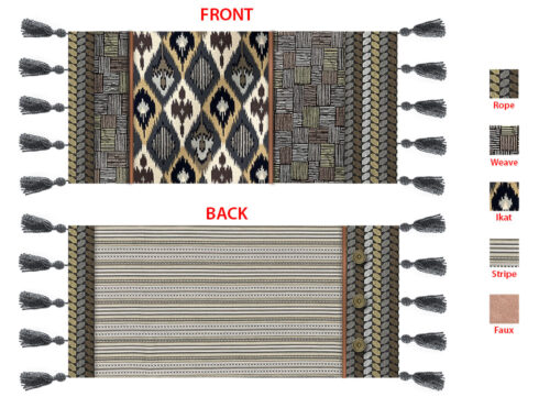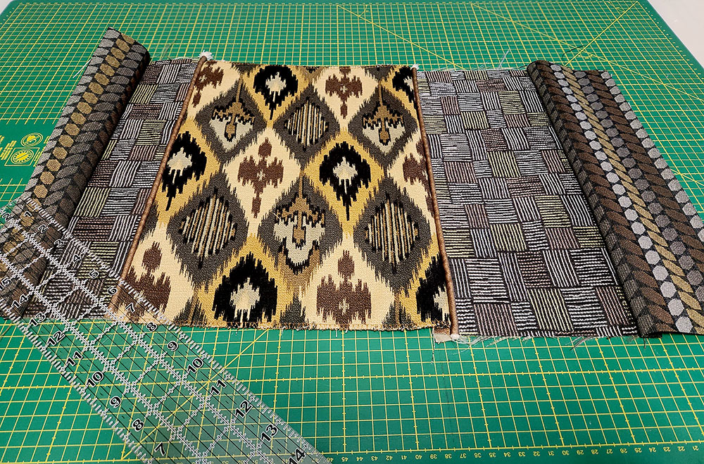 NOTE: As mentioned above, we started with a ½ yard of all our upholstery fabrics in order to get the best fussy cuts. You may be able to get away with smaller cuts, remnants or scraps, but do keep in mind the height of each main cut is 14”. Widths should not be a problem as home décor and upholstery fabrics are traditionally 50”+ wide. We’ve included a fabric key below so you can follow which fabric we are referring to on our sample.