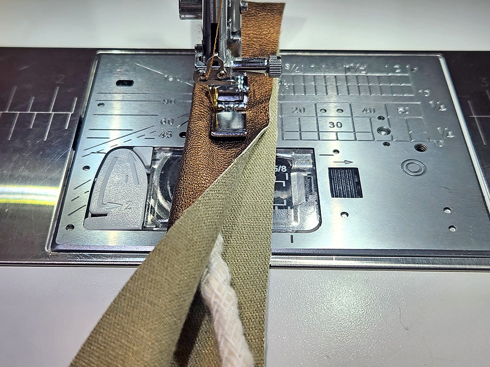 - Attach a Zipper foot and thread the machine with thread to best match the piping fabric in the top and bobbin. Set for a slightly lengthened stitch.