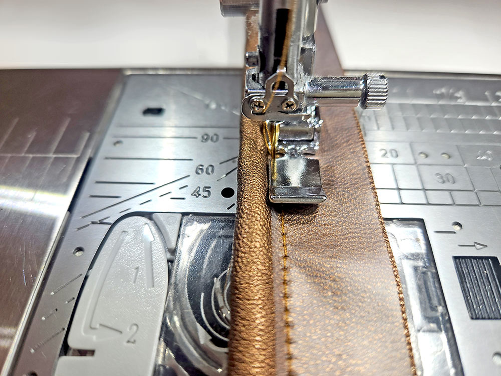 - If using faux leather as we did, it may want to stick to the presser foot. We often opt for the Janome Ultra Glide foot when working with sticky fabrics, but that is not available in a Zipper foot option. Instead, you can place cellophane/magic tape the length the flange. Its surface will allow the presser foot to move smoothly.