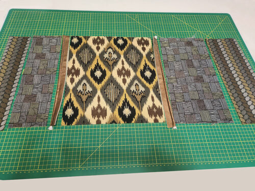 - From the fabric for the main front “center” panel (Ikat in our sample), cut ONE 12” wide x 14” high rectangle.