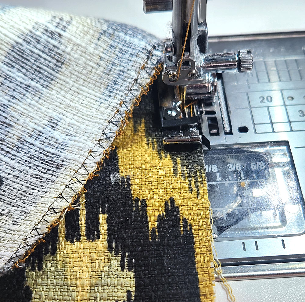 NOTE: If you want more tips and tricks, check out our full tutorial on Sewing Thick Layers. - Depending on the “ravel-ness” of your fabrics, you can choose to trim back your sewn seam allowance around all four sides and once again use an Overcast foot to help seal all the seams.