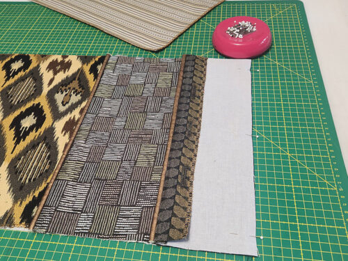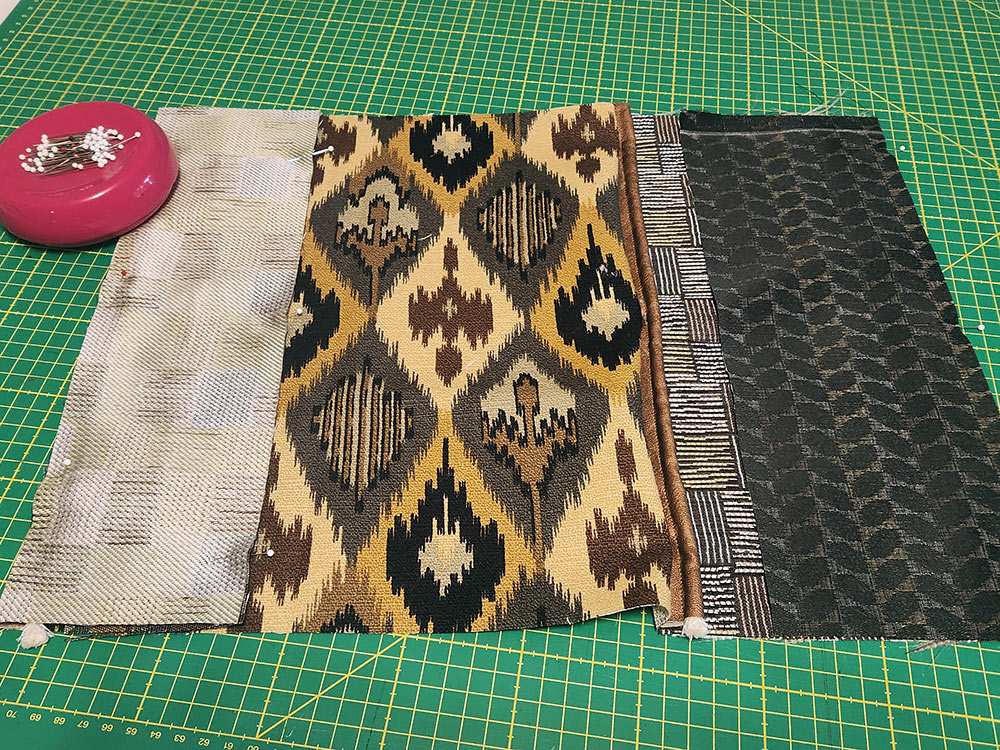 The pillow finishes at 12” x 26” and the cuts we recommend for the front and back are small enough to qualify as scraps. There might be something hiding in your specialty stash. If you’re shopping in-store, look for remnants or even ask about their out-of-stock upholstery sample books, which often feature quite large pieces. We ended up purchasing ½ yard cuts of all our fabric choices because we love fussy cutting and that always takes a bit more fabric. We used four upholstery cuts and one faux leather cut.
