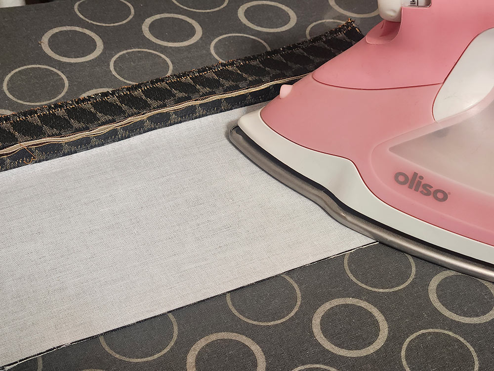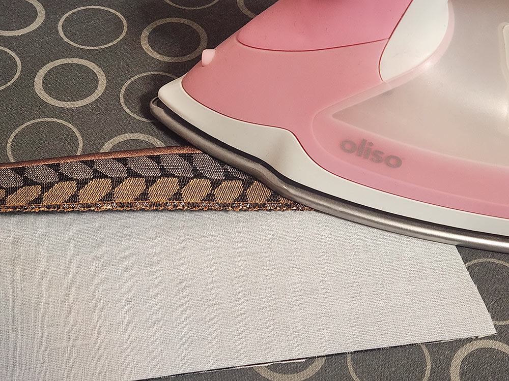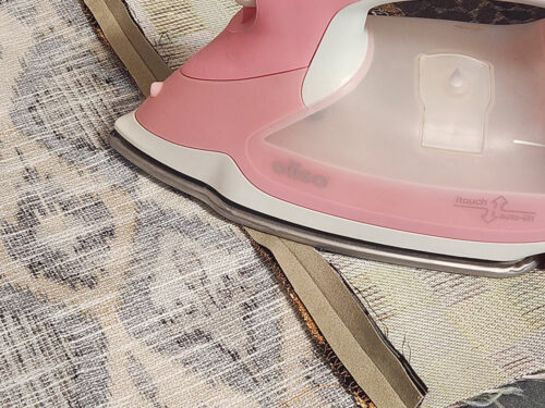- Fold the facing to the back so the piping is revealed. It should be one even line from top to bottom. Press carefully to hold this fold. We are not showing a pressing cloth in this photo, but you may want to consider it when working with faux leather.