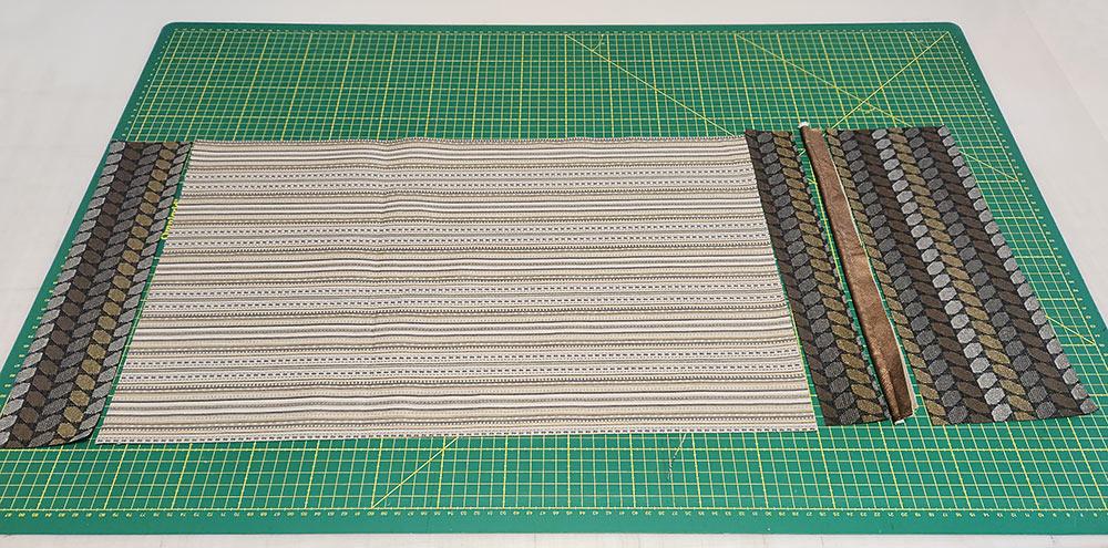 - Gather all the elements for the pillow’s front panel: two end panels, two side panels, one center panel, and two piping strips.
