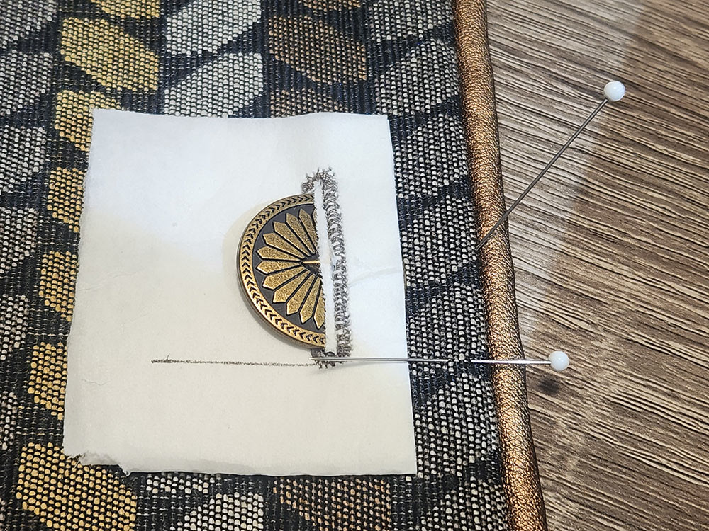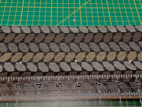 - However, we wanted our vertical buttonholes to be centered within a particular stripe within our Rope fabric, so we stitched out a sample buttonhole on scrap fabric and used this to set a few additional pin marks to get the perfect position we were looking for.