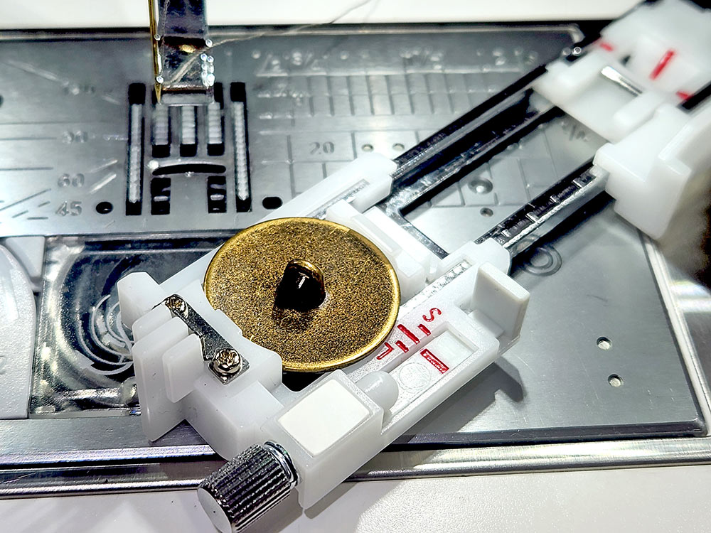 - We used the Janome Automatic Buttonhole foot. When using a shank button with this foot, simply set it into the back of the carriage upside down.