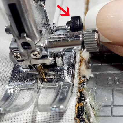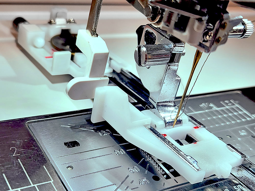 - Because you are sewing with thicker layers, especially as you cross over the piped edge of the buttonhole panel, you may want to use a couple special tools to help keep your presser foot flat. This is key to keeping your layers feeding smoothly and evenly!