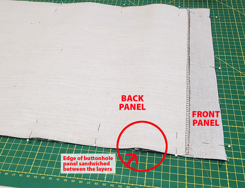 - Place the buttonhole panel into position, right side down on the right side of the main panel. As shown in the photo below, the raw edge of the buttonhole panel is flush with the raw edge of the main panel and the piped edge is facing in towards the center. Pin in place along the right side.