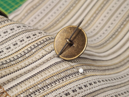 - Pull out the underlap panel and securely hand stitch each shank button in place. An overlap closure such as this can be subject to a fair amount of tugging, so don’t be afraid to use a doubled strand of thread, lots of loops through the shank, and a strong double or triple knot at the back to secure.