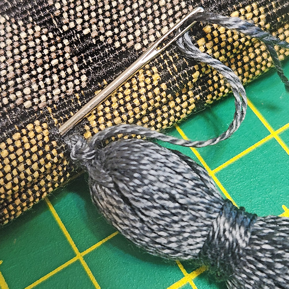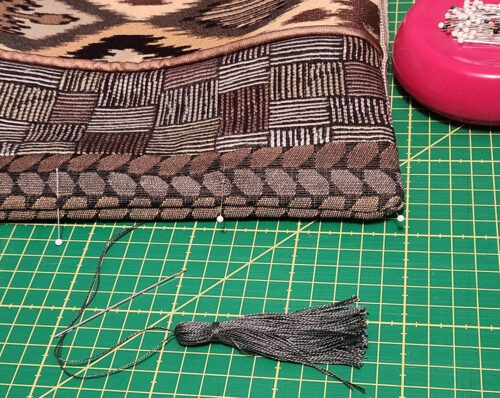 - The single strand tie at the top of each tassel should be at least 12” in length in order to most easily sew the tassels along the seam. After stitching in place and knotting to secure, send the needle and remaining thread down through the center of the tassel to hide the thread within the body of the tassel. Remove the needle and trim the thread tails to match the tassel.