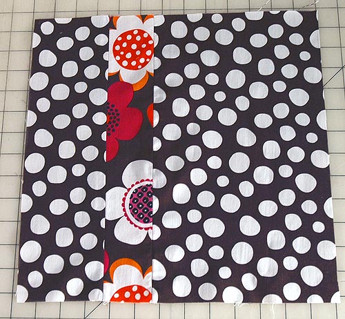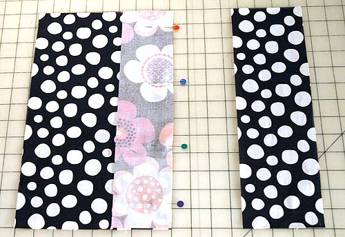 - Pin remaining front piece (the 4″ x 13″ rectangle) to the other side of the stripe inset, right sides together.
