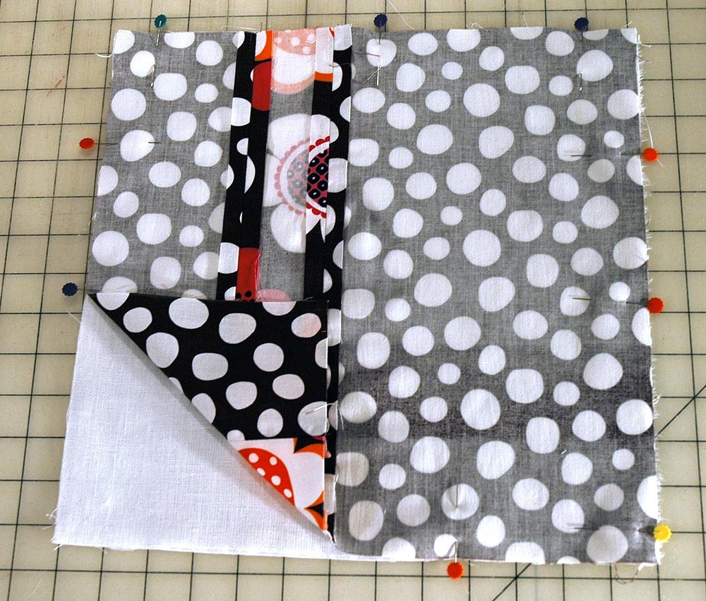 - With right sides together, pin completed pillow front to pillow back 13″ x 13″ square.