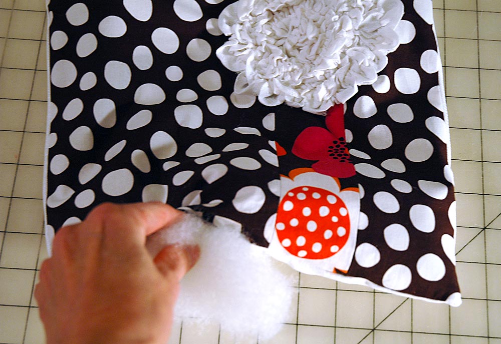 - Once the flower is secure, stuff the pillow with fiberfill until it’s plump and firm.