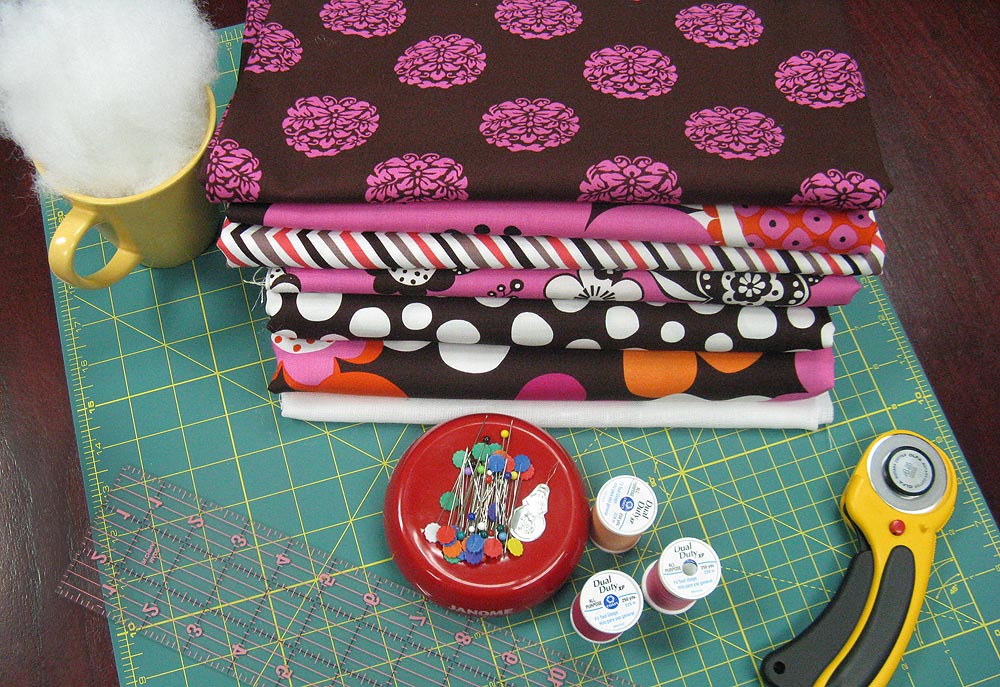 - Fabric for pillow front panels: ½ yard of 45″ wide fabric PER PILLOW: we used Paula Prass’ Woodland Delight in Brown Large Modern Flora (pillow A), Brown Pebble Stone Earth Mod Blooms (pillow B – our ‘sample’ pillow), and Fuchsia Woodcut Garden (pillow C)