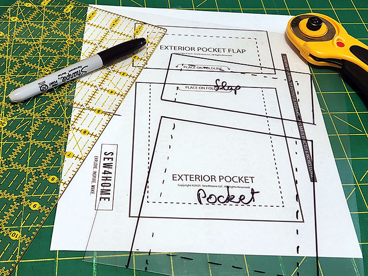 - Download and print out our ONE pattern sheet that includes the pattern pieces or the front pocket and the front pocket flap.