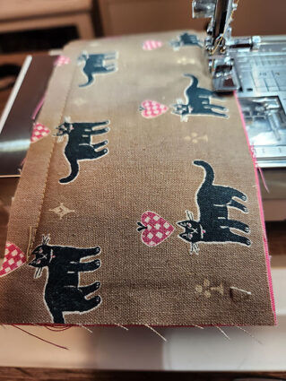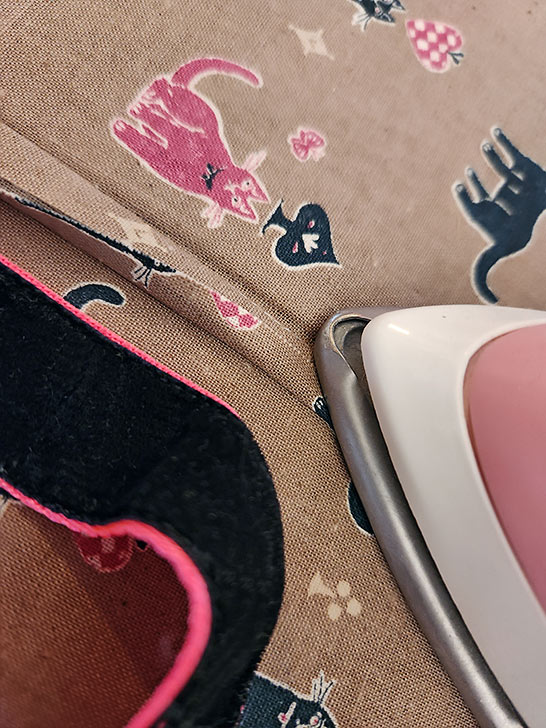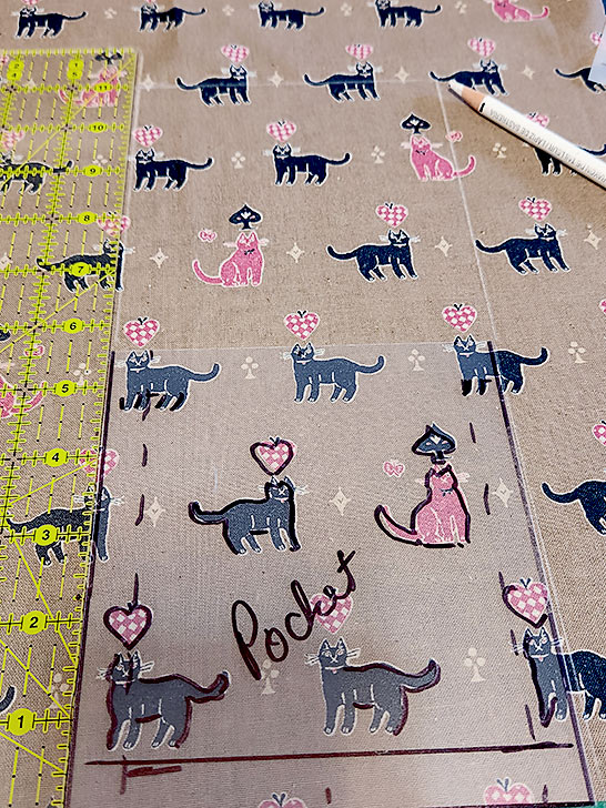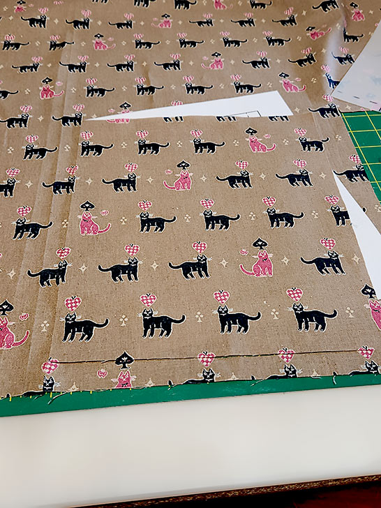 - Cut your main front panel, centering your fabric’s motif side to side and top to bottom. With our cute kitty print, we worked to balance the number of of black and pink kitties and made sure our horizontal rows of kitties were perfectly straight. We also kept in mind that there will be eventually be a ribbon across the top.