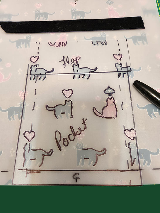 - Place your transparent pocket and flap templates into position (centered) onto the main front panel and trace several bits of the motif onto the template.