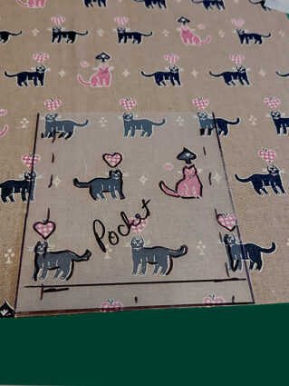 - Starting first with the pocket, bring the traced template to the remaining fabric, moving the template around until you have a perfect match of your traced elements with the real elements on the fabric.