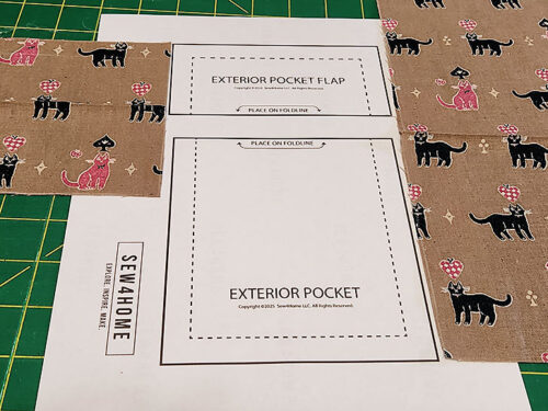 Using the pocket and flap patterns, and cutting on the fold, cut ONE of each — if fussy cutting and pattern-matching follow the steps below to cut the pocket and flap.