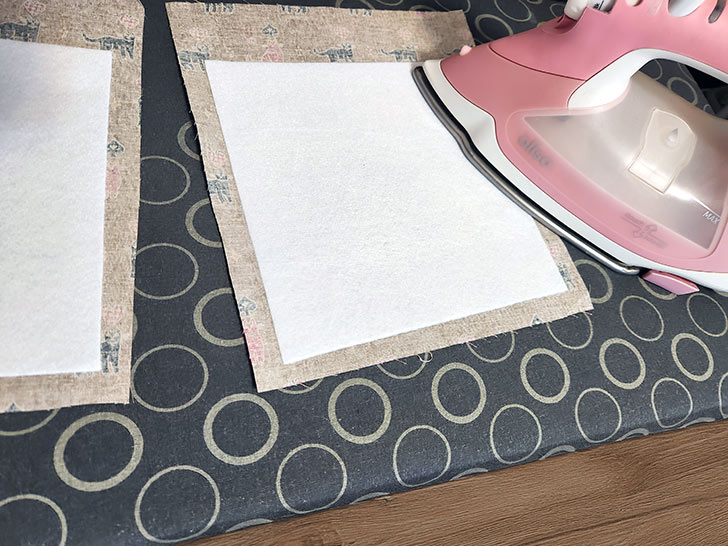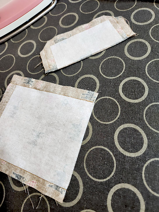 - On each piece, center the fleece side to side on the wrong side of the fabric, leaving ⅝” of fabric showing beyond the interfacing along both sides and ½” showing across the bottom. This means the top of the fusible fleece sits 1¾” down from the top raw edge of the panel. Following manufacturer’s instructions, fuse in place.