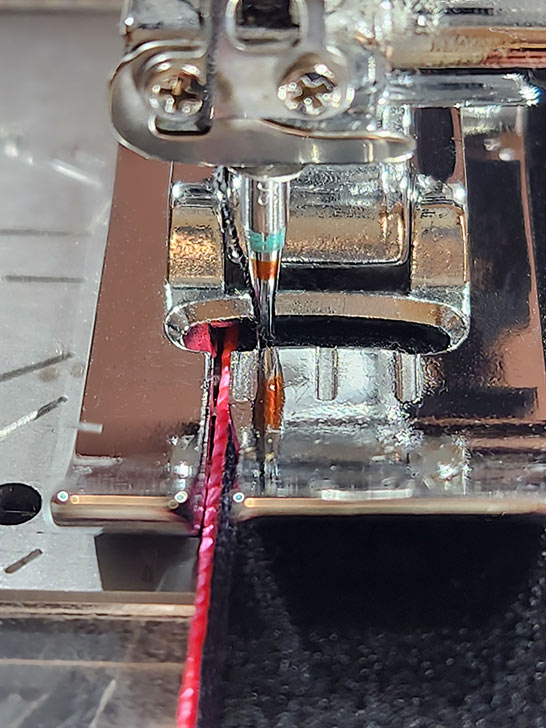 - Still using a Right Bi-Level foot and the contrasting thread, edgestitch across just the top of the flap. This single seam also seals the opening used for turning.