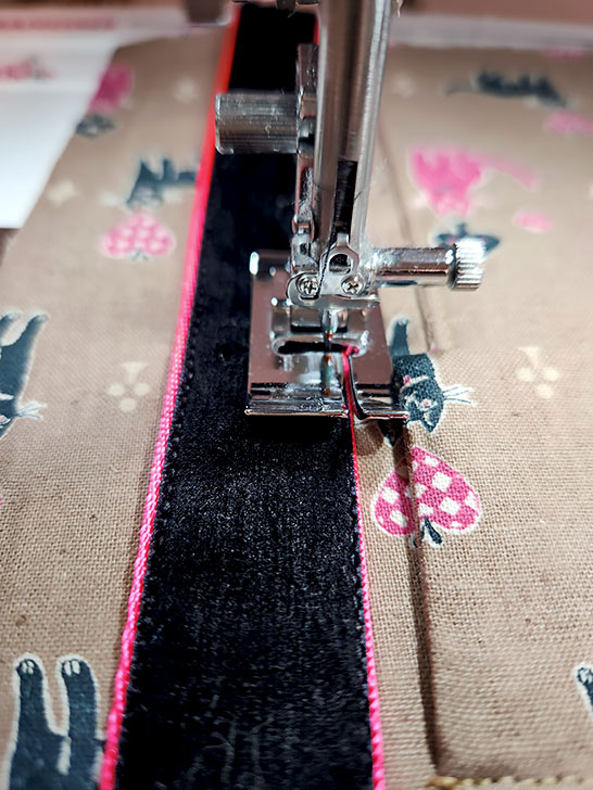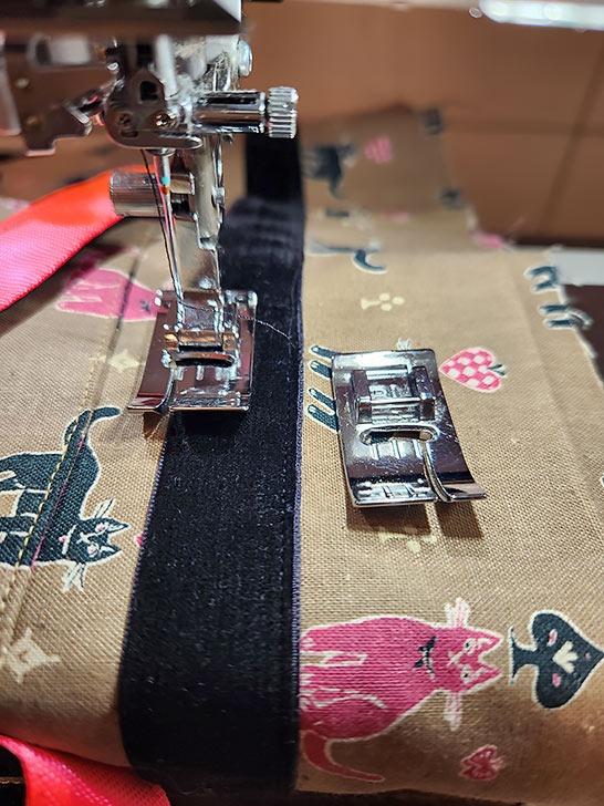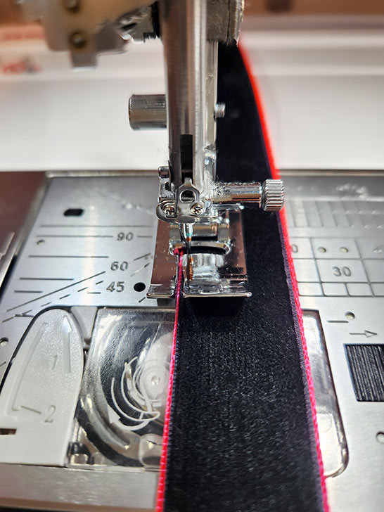 NOTE: We opted to keep the Topstitching needle in place throughout the remainder of construction since we are continuing to work with thicker layers and with additional topstitching and edgestitching seams. - We once again turned to the two Janome Bi-Level feet to stitch the ribbon in pace. Stitching around the top of the ribbon first with the Right Bi-Level foot.