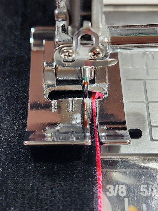 - We switched to our transparent Satin Stitch foot so we could see through to the ribbon.